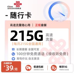 🚀【联通随行卡】超值来袭!🚀🌟只需39元/月,畅享215G全国通用流量+100分钟通话