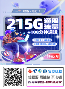 套餐资费:39元/月享215G全国通用+100分钟通话(高性价比,全能配置,自主激活,超大流量)