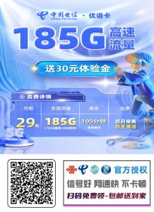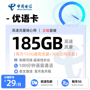 [好卡推荐]电信优语卡 29元/月享155G通用+30G定向+100分钟全国通话