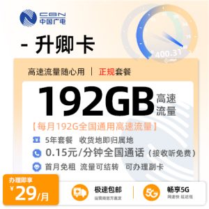 套餐资费:29元/月享192G全国通用流量(五年套餐,首月免租,流量结转)