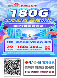 [好卡推荐]联通江龙卡 29元/月享180G全国通用+300分钟通话