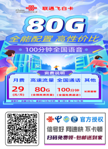🚀联通飞马卡 29元/月享80G全国通用流量+100分钟