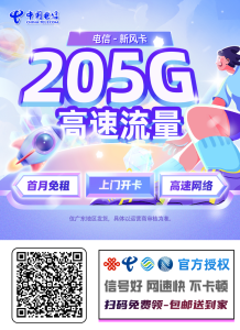 [好卡推荐]电信新风卡【广东专属】 39元/月享205G全国通用流量+100分钟
